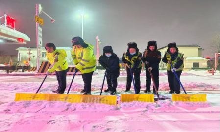 交发集团所属高速集团团员青年迅速集结、奋勇投身除雪除冰一线,齐心协力清除收费广场路面积雪积冰,主动为除雪防滑作业人员、堵塞滞留人员提供热水、就餐等服务保障,并提供维修工具、简易包扎、路况咨询等服务,以实际行动绘就风雪中的青春底色。