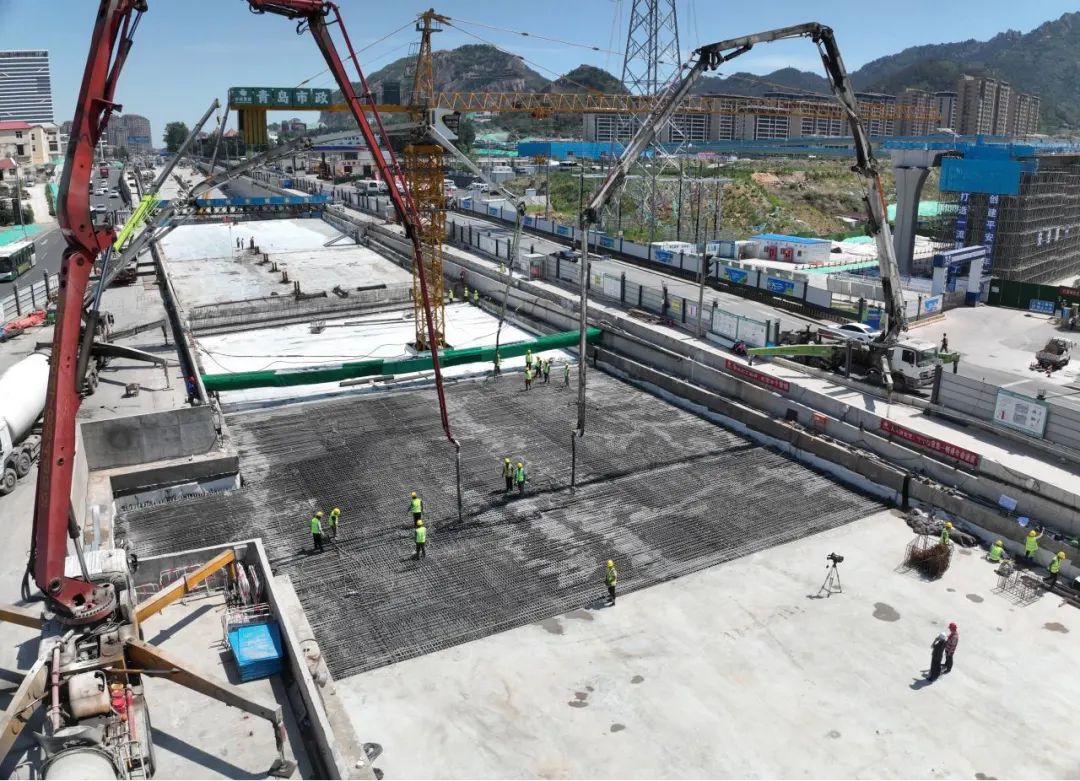 为保障过往车辆日间正常通行,交发集团优化施工工序,同步推进实施土方开挖和地道主体施工,利用夜间施工窗口期,调配泵车、运输车集中开展施工作业,于5月31日车流高峰来临前完成全部土石方开挖任务。针对施工场地狭窄、施工时间有限等条件制约,交发集团在剩余地道闭口段增配塔吊2部、泵车4台、吊车5台及不锈钢模板、支架等一次性建设材料,增加劳务人员200余名,仅用两周时间布设完成5板底板、6板侧墙、7板顶板,浇筑混凝土共12000立方米。