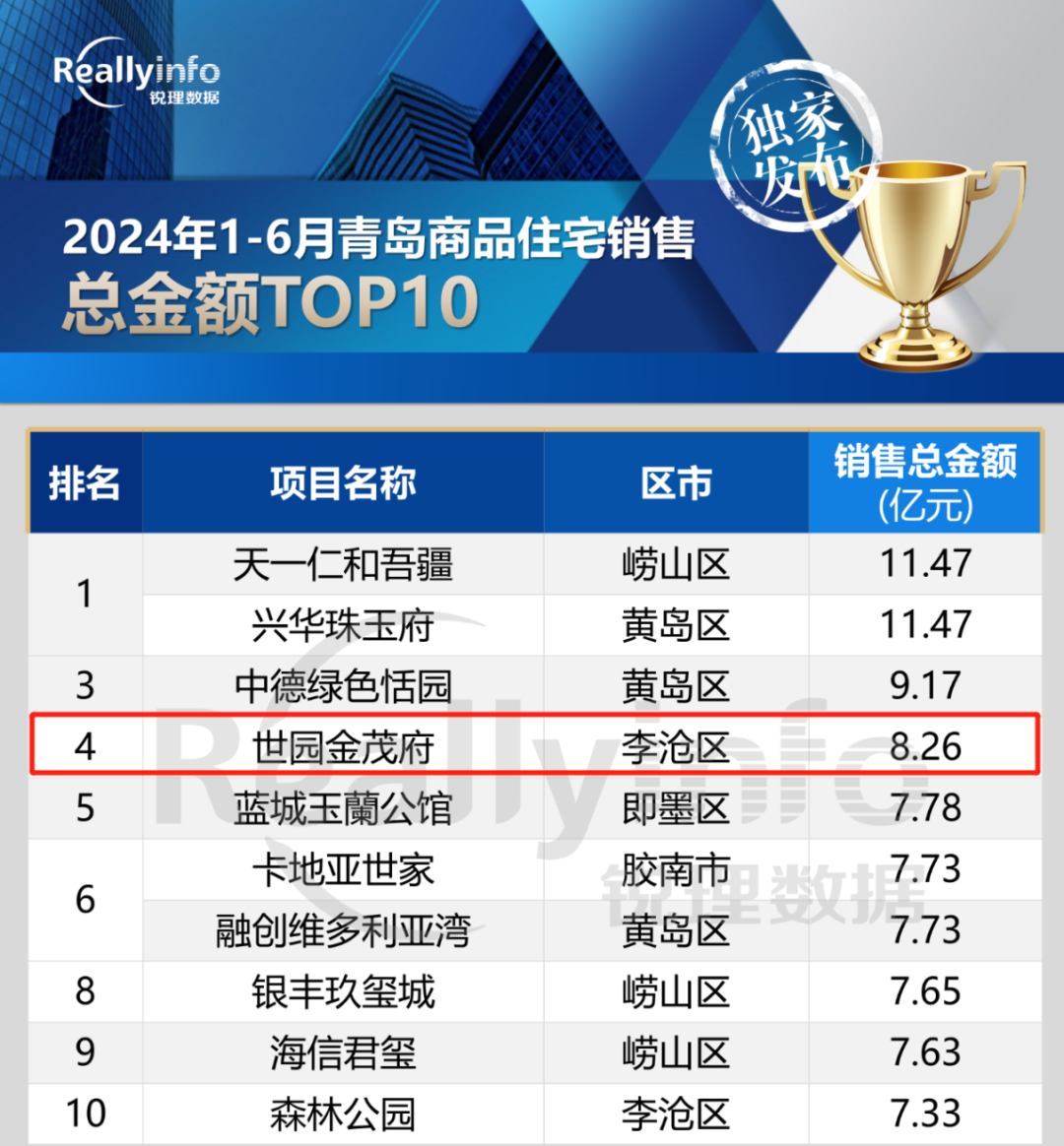 近日,锐理数据发布“青岛房市年中榜”,青岛乐鱼在线注册_乐鱼(中国)集团世园·金茂府以8.26亿销售总金额荣登青岛市2024上半年网签金额第四名,稳居李沧区第一名。