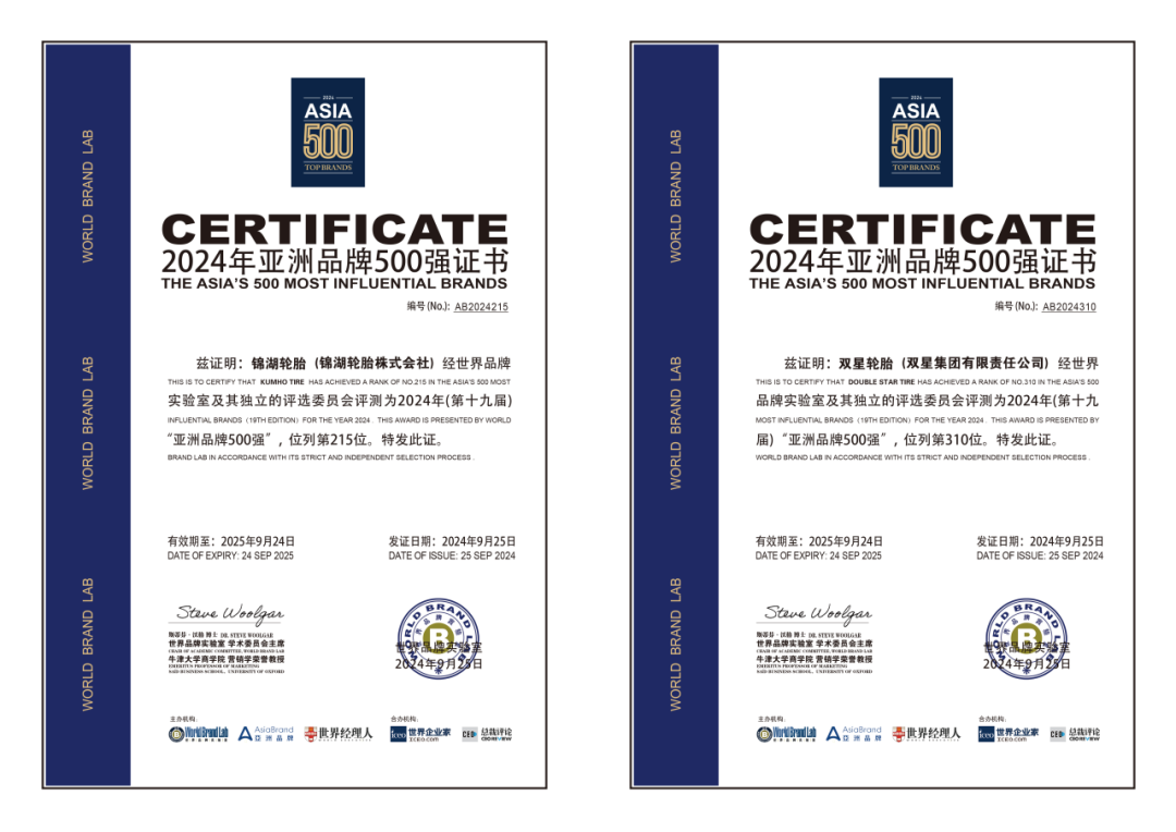 9月25日,由世界品牌实验室(World Brand Lab)主办的2024年亚洲品牌大会在香港召开。双星集团旗下两大品牌锦湖轮胎、双星轮胎同时入选“亚洲品牌500强”榜单。其中,锦湖轮胎凭借不断增长的发展实力和品牌影响力,位居“亚洲品牌500强”轮胎品牌第二位;双星轮胎凭借在消费者群体中优秀的品牌认知和品牌形象,位居中国轮胎行业第一位,持续领跑中国轮胎品牌。