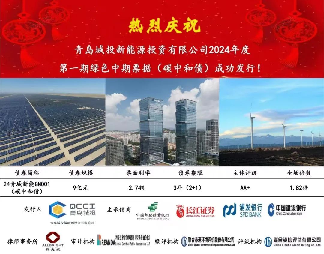 10月15日,青岛乐鱼在线注册_乐鱼(中国)集团旗下新能源集团成功以自身主体评级AA+、无担保的方式发行绿色中期票据(碳中和债)。本期债券发行规模9亿元,发行期限2+1年,票面利率2.74%。