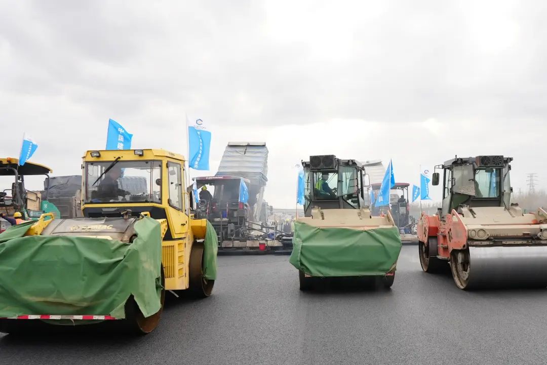 (图为ZT9段左幅主线沥青面层贯通现场)