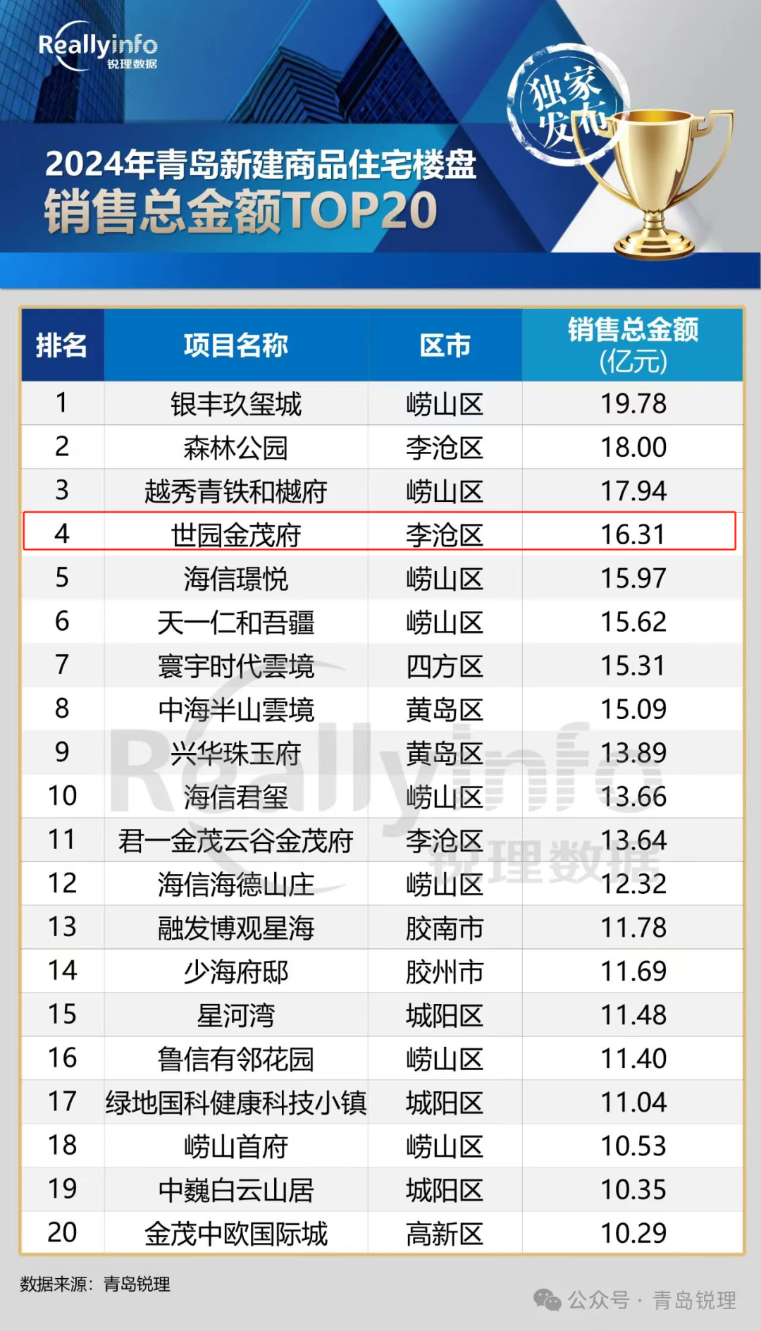 近日,2024年青岛市商品房销售榜单正式发布,青岛乐鱼在线注册_乐鱼(中国)集团世园·金茂府项目以16.31亿元销售总金额荣登2024年青岛新建商品住宅楼盘销售金额榜第4名,超额完成全年销售目标任务。