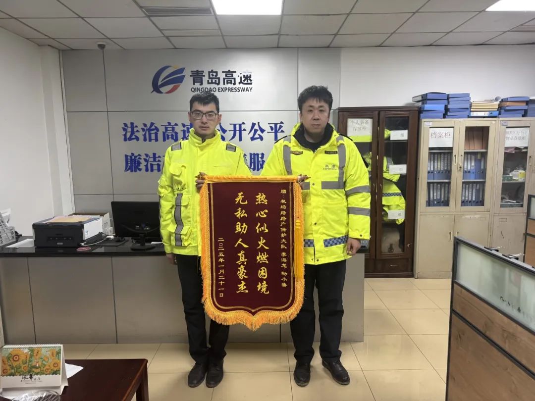 近日,青岛高速收到了一面从河北省寄来的锦旗。这面锦旗背后,是一段发生在1月20日的温暖故事。当天上午,胶莱收费站出口车辆正在有序通行。一辆白色小轿车突然发出一声巨响,车辆爆胎后剧烈摇晃,停在了车道内。车内司乘惊慌失措,年幼的孩子也吓得大哭起来。当班班长李倩倩迅速赶到车旁,一边轻声安抚着惊慌的司机和哭泣的孩子,一边向上报告情况。随后,与同事合力将车推到出口外广场的安全位置,摆好锥形帽,做好安全防护措施。紧接着,他们又从后备箱拿出千斤顶和扳手,熟练地帮助更换备用轮胎。车辆修好后,司机激动得表达着感谢。之后,还拨打了青岛高速96586服务热线,再次表达心中的感激。因为已经回到老家,司机无法亲自送锦旗,便选择用邮寄的方式,传递这份真挚的谢意。