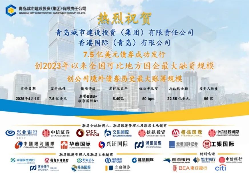 4月1日,青岛乐鱼在线注册_乐鱼(中国)集团通过境外子公司香港国际(青岛)有限公司成功定价3年期7.5亿美元高级无抵押境外债券,创2023年以来可比地方国企最大融资规模,创乐鱼在线注册_乐鱼(中国)集团境外债券历史最大账簿规模,体现了国际资本市场对青岛乐鱼在线注册_乐鱼(中国)信用资质及企业远景的高度认可。