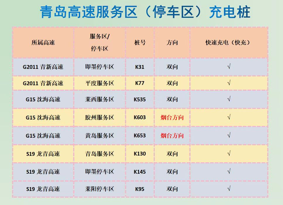 青新高速K31即墨停车区双向、青新高速K77平度服务区双向、沈海高速K535莱西服务区双向、沈海高速K603胶州服务区烟台方向、沈海高速K653黄岛服务区烟台方向、龙青高速K130青岛服务区双向、龙青高速K145即墨停车区双向、龙青高速K95莱阳停车区双向。