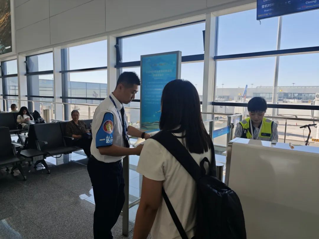 (图为工作人员引导旅客至登机口)