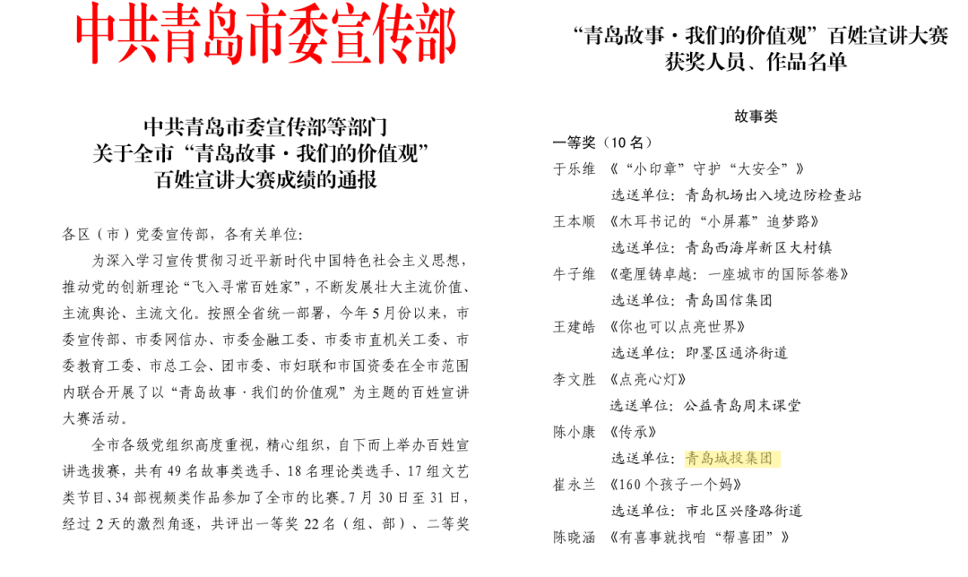 近日,由市委宣传部、市委网信办等九部门联合主办的“青岛故事·我们的价值观”百姓宣讲大赛圆满落幕。青岛乐鱼在线注册_乐鱼(中国)集团旗下青岛高速青年职工陈小康的宣讲作品《传承》荣获故事类一等奖。值得一提的是,自2022年以来,青岛乐鱼在线注册_乐鱼(中国)集团选送作品已连续四年斩获全市一等奖及国资系统一等奖,并连续四年荣获市百姓宣讲大赛国资系统选拔赛“优秀组织奖”,充分展现了集团在思想宣传和队伍建设方面的扎实成效。
