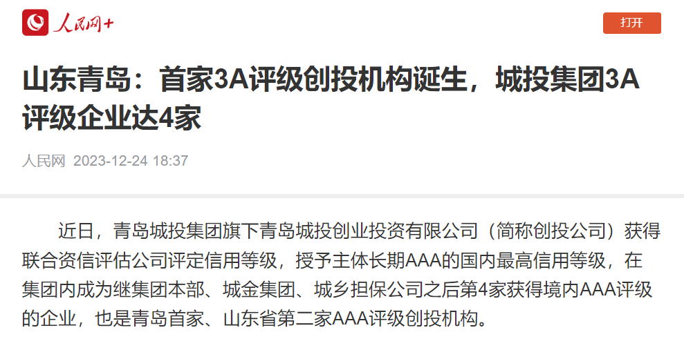 人民网:山东青岛首家AAA评级创投机构诞生,乐鱼在线注册_乐鱼(中国)集团3A主体评级企业达4家