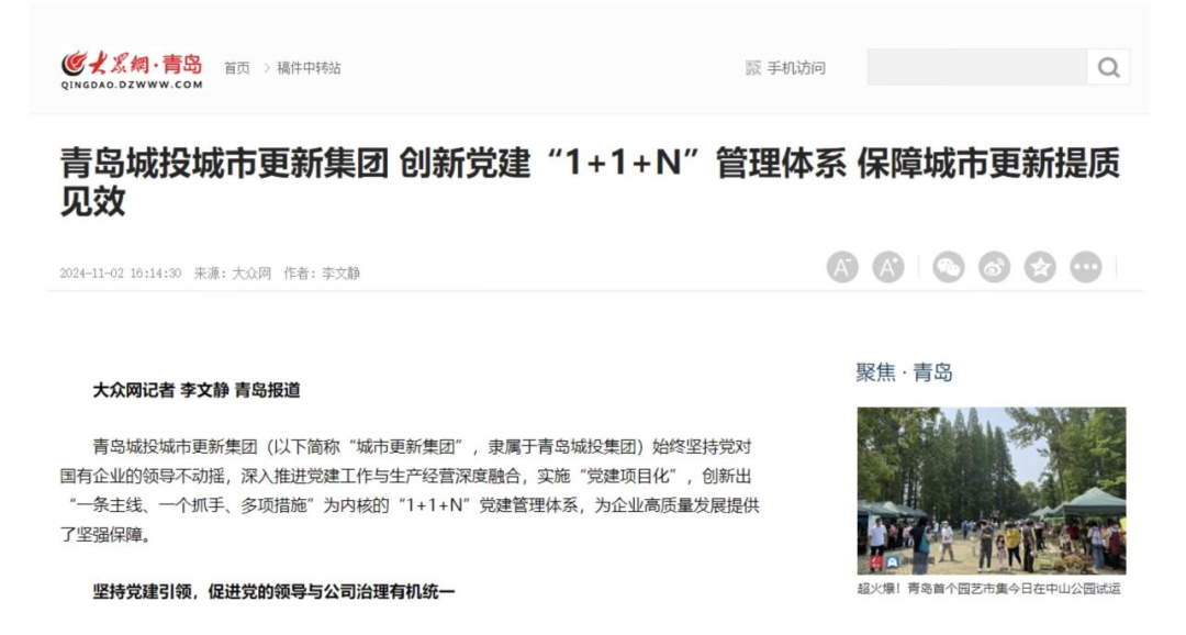 近日,大众网刊发了青岛乐鱼在线注册_乐鱼(中国)集团旗下城市更新集团《创新党建“1+1+N”管理体系 保障城市更新提质见效》文章,报道城市更新集团创新党建工作,深入推进党建工作与生产经营深度融合方面的优秀成果,以下为报道原文:
