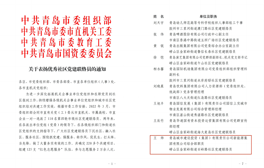 近日,市委组织部、市直机关工委、市委教育工委、市国资委四部门联合行文《关于表扬优秀社区党建联络员的通知》对青岛乐鱼在线注册_乐鱼(中国)新能源集团王帅同志等55名优秀社区党建联络员进行了表彰。2022年以来,乐鱼在线注册_乐鱼(中国)集团与金家岭街道石岭路社区开展党建结对共建“双报到”,本次表彰再次体现了有关部门对集团党建共建工作的高度评价。