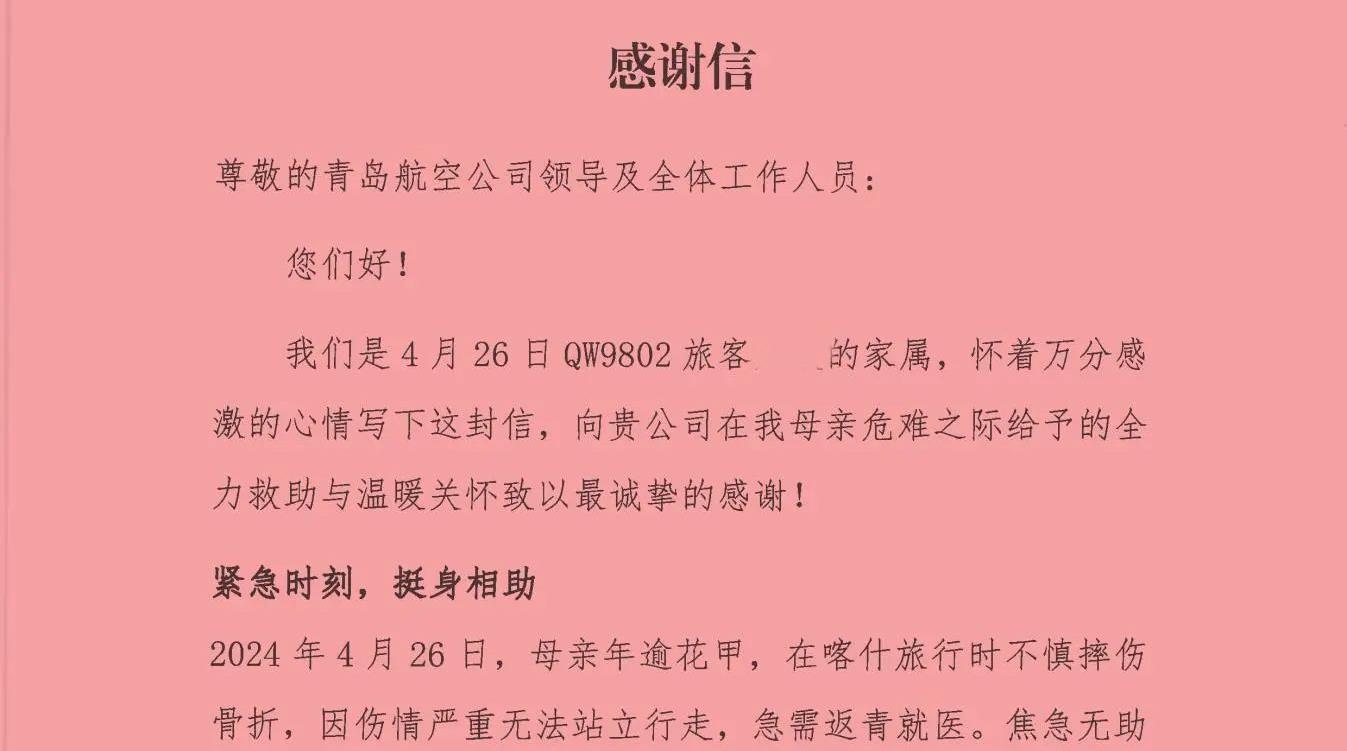 近日,一封含“赞”量满满的感谢信被专程送到了青岛乐鱼在线注册_乐鱼(中国)集团旗下青岛航空的值机柜台。信中,旅客家属用“雪中送炭的人间大爱”形容这段跨越千里的护航之旅,字里行间流淌的真情,让这封不足千字的信件成为青岛航空真情服务的最佳见证。(图为乘客发来感谢信)4月26日,年逾花甲的旅客万女士在喀什旅行时不慎摔伤骨折,因伤情严重无法站立行走,需搭乘青岛航空QW9802航班返青就医,家属在焦急无助之际联系青岛航空求助。接到旅客求