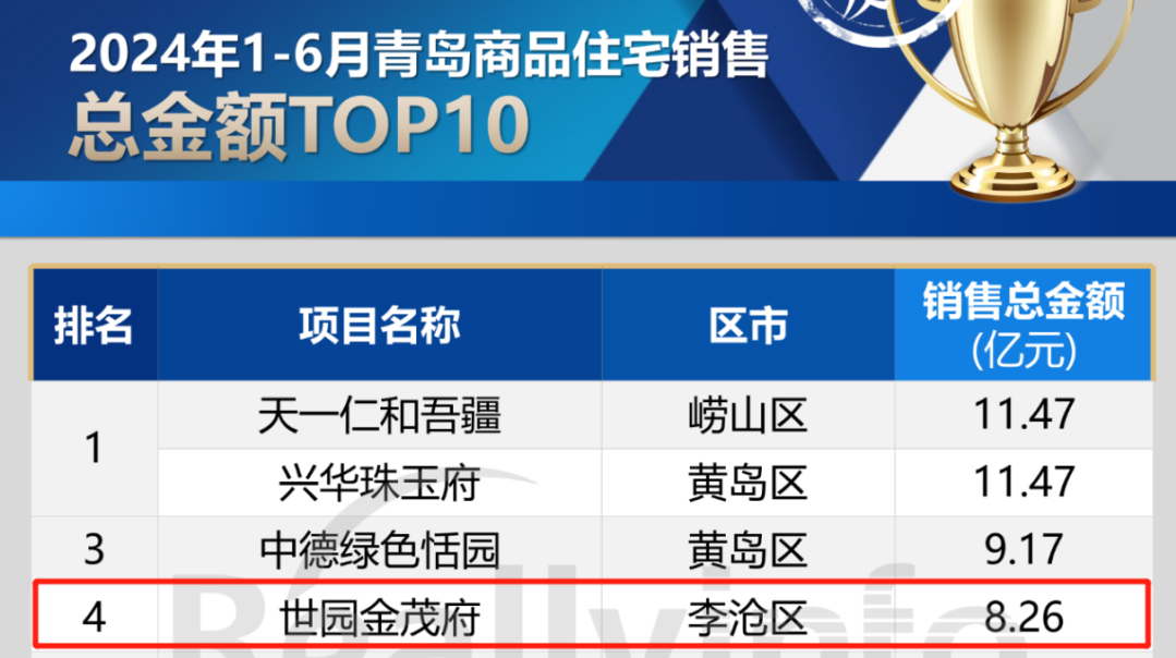 近日,锐理数据发布“青岛房市年中榜”,青岛乐鱼在线注册_乐鱼(中国)集团世园·金茂府以8.26亿销售总金额荣登青岛市2024上半年网签金额第四名,稳居李沧区第一名。