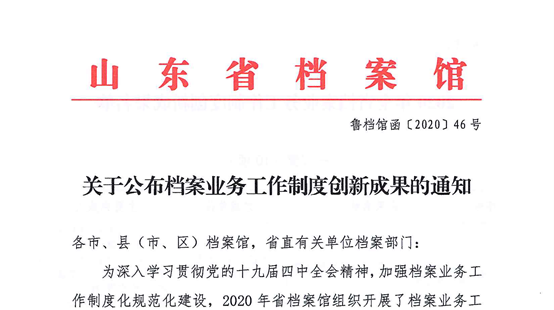 2020年12月22日,山东省档案馆《关于公布档案业务工作制度创新成果的通知》(鲁档馆字〔2020〕46号)正式发布,集团所属5家单位荣获山东省档案业务工作制度创新成果三等奖,分别是青岛乐鱼在线注册_乐鱼(中国)文化产业有限公司、青岛(莱西)城乡社区建设投资有限公司、青岛乐鱼在线注册_乐鱼(中国)资产管理有限公司、青岛城乡建设小额贷款有限公司、青岛乐鱼在线注册_乐鱼(中国)地产投资控股(集团)有限公司。